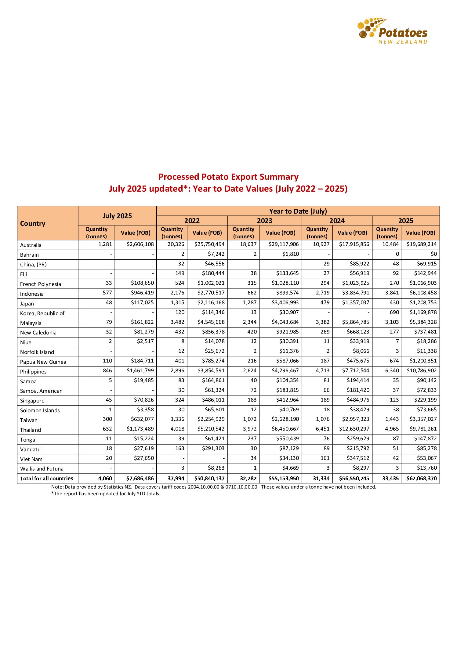 Processed Potato Export Report – July 2025: Year to Date Values