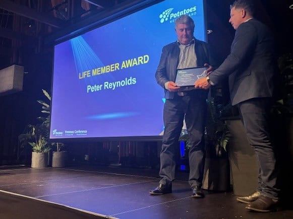 Pukekohe vegetable grower Peter Reynolds has been presented with a Potatoes New Zealand Life Member Award at last night’s Potato Industry Awards 2025.