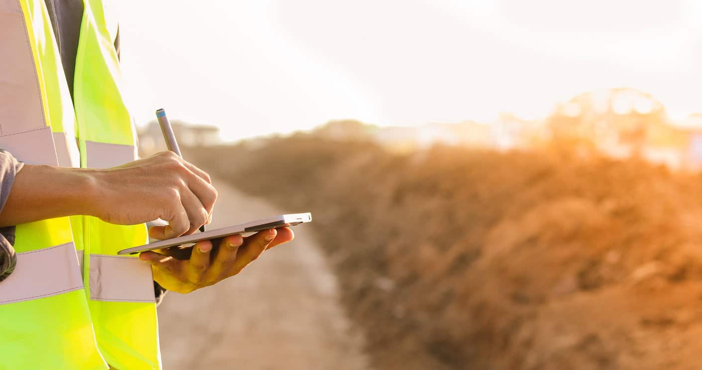 engineer with hardhat using tablet pc computer inspecting and working at construction site by Sheree | Share this: